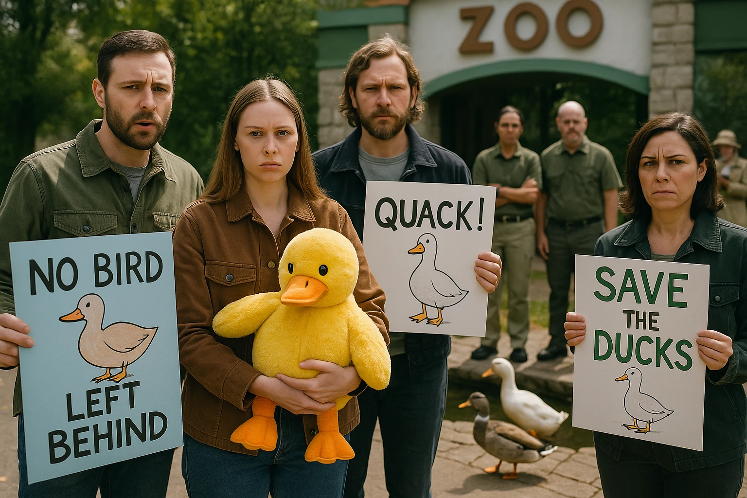 Local tranquility was shattered this morning as word spread that the city zoo had relocated several ducks from one pond to another, igniting a wave of panic over what citizens now fear is the opening salvo of a sweeping government-mandated ‘Fowl Relocation Program.’ What began as an innocuous animal management decision has, in the hands of Top Coverage News, become a crisis of unprecedented civic anxiety. Community members gathered at the zoo gates, some clutching hand-painted signs reading, “Don’t Displace Our Ducks!” and “No Bird Left Behind.”